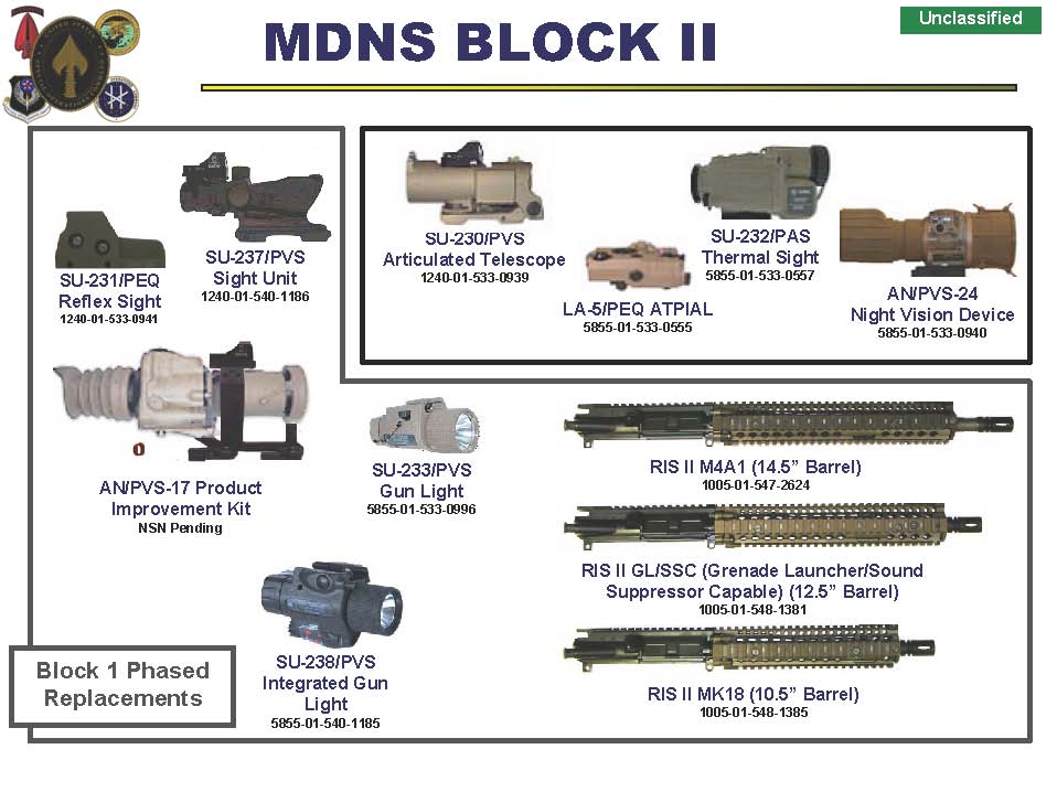 What really adds teeth to the M4A1/CQBR is the aforementioned SOPMOD program which provides outstanding modularity and sets it apart from any other weapon system in the world. Some of the best available technology is being fielded to our guys downrange, enabling them to get the job done anywhere, anytime. The program keeps current with emerging technologies and it shows when comparing the current kit to the former. My units weapons were typically set up with an EOTech Holographic Weapon Sight, an Advanced Target Pointer/ Illuminator/ Aiming Light (ATPIAL), and an M3X Weapon Light. The actual names for all of the gear gets confusing as you can see from the Block II image. The systems I just named in tech-speak would be the SU-231/PEQ, LA-5/PEQ ATPIAL, and the SU-233/PVS. A mouthful and far more confusing than just using the commercial names for the equipment which is what most do in practice.