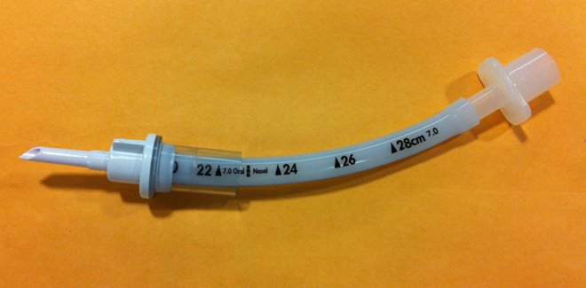 Step 1 Cut the 7.0 Endotracheal tube at a right angle to its long axis at the 20 cm mark. Keep the short end with the adapter, get rid of the end with the balloon on it. You don’t need it.