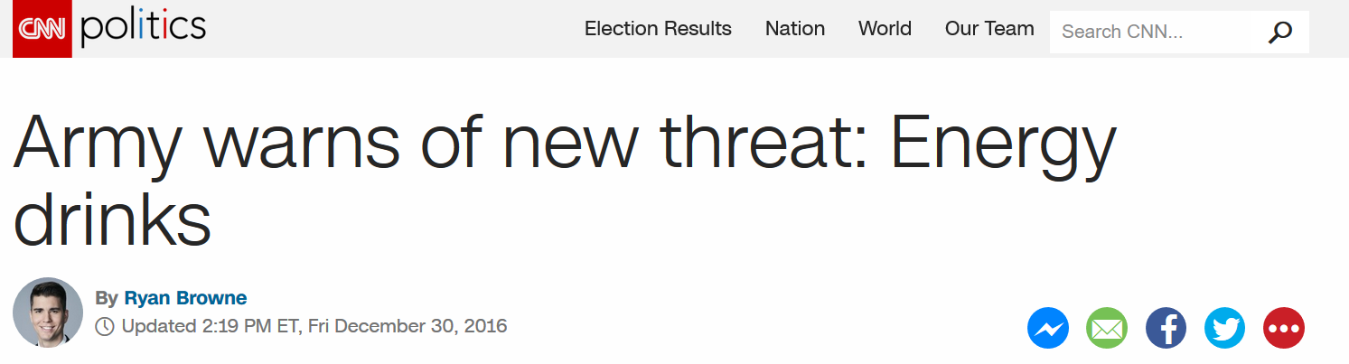 Smoking, like energy drinks, is bad for you – and just about every man and woman you run across in uniform is aware of that. The problem is, car bombs, IEDs, and 7.62 rounds are also pretty bad for you – and we need to survive those in order to be concerned about the damage that last Camel did to our lungs, or that Rip It did to our livers. CNN’s announcement today that the “Army’s new threat” is energy drinks is a clear misunderstanding of what our service members actually do while they’re at work.