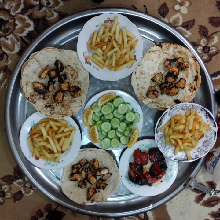 We ate our evening meal sitting on the floor around the platter the cook brought in. Chicken, bread, sliced cucumber, roasted tomatoes and French fries made for a fine first dinner in the safehouse. I am grateful the Iraqi Counter Terrorism Service travels with their own cooks.