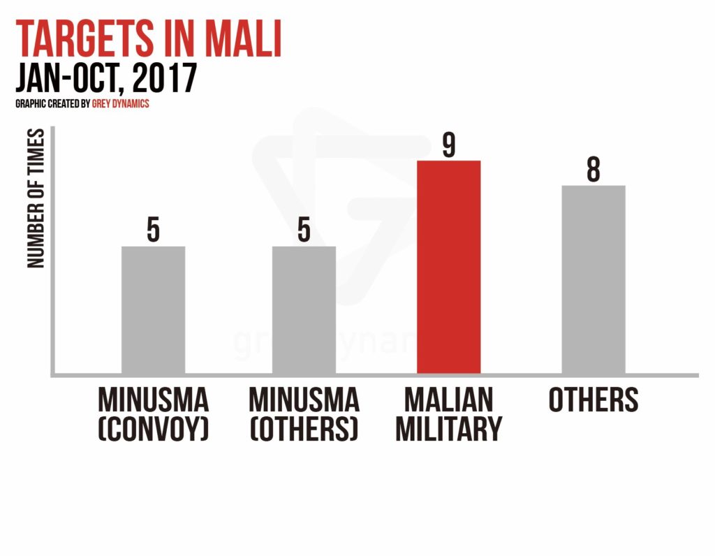 The ITGs operating out of Mali has demonstrated a preference toward guerrilla-style ambushes on soft targets, primarily the Mali security forces and United Nations Multidimensional Integrated Stabilization Mission in Mali (MINUSMA). One tactic preferred by the ITGs is to ambush a patrol, usually initiated by either VBIED or IED, followed by a force of equal or greater numbers to the patrol. They have also shown their ability to identify weak FOBs of the Mali security forces, and they would begin their assault with IDF/mortars: 82mm & 120mm.