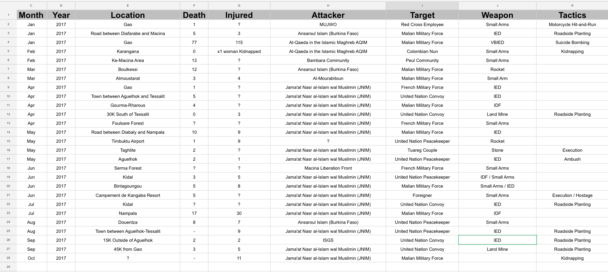 Islamic State in Iraq and Levent (ISIL) also gained a partner in the Mali this year, the Islamic State in the Greater Sahara (ISGS). Once again, reports indicate that this group is responsible for attacks as early as mid-2016, and while this is possible, it probably would have been underneath one of the previous organizations. It appears that ISGS is a relatively new, small group that doesn’t have a lot of backing at this time. Having said that, they were able to launch an assault on U.S. special forces soldiers on the Mali-Niger border, which resulted in four U.S. soldiers KIA.
