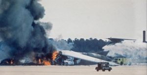 In the torrent of flame, I saw pieces of wreckage and machinery hurtling along. As the torrent rushed in I could hear cries of alarm, curses, and someone yelling “run” from the mock-ups. The fire blast crackled as it blasted in, and at its sides, it curled outward as it went forward. I was standing perhaps 30 feet beside the edge of the blast and could see eddies of the flame curling out toward me. I turned and ran from the flame, to just beyond the right end of the pack shed, where… I no longer felt the intense heat, so I stopped. To my left, out on the aircraft ramp, now in my line of sight, I could see a parked C-141 engulfed in flames. It was the left one of a pair of C-141s parked there.”