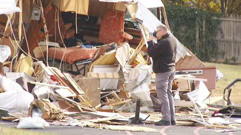 An investigator photographs the destroyed RV believed to belong to Michael Brown. (WSLS)