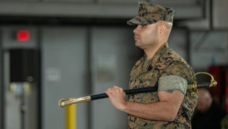 Former Marine Sergeant Major Clawson holds his sword with solemn pride, a symbol of duty and honor—a reminder of the responsibility that comes with every rank.