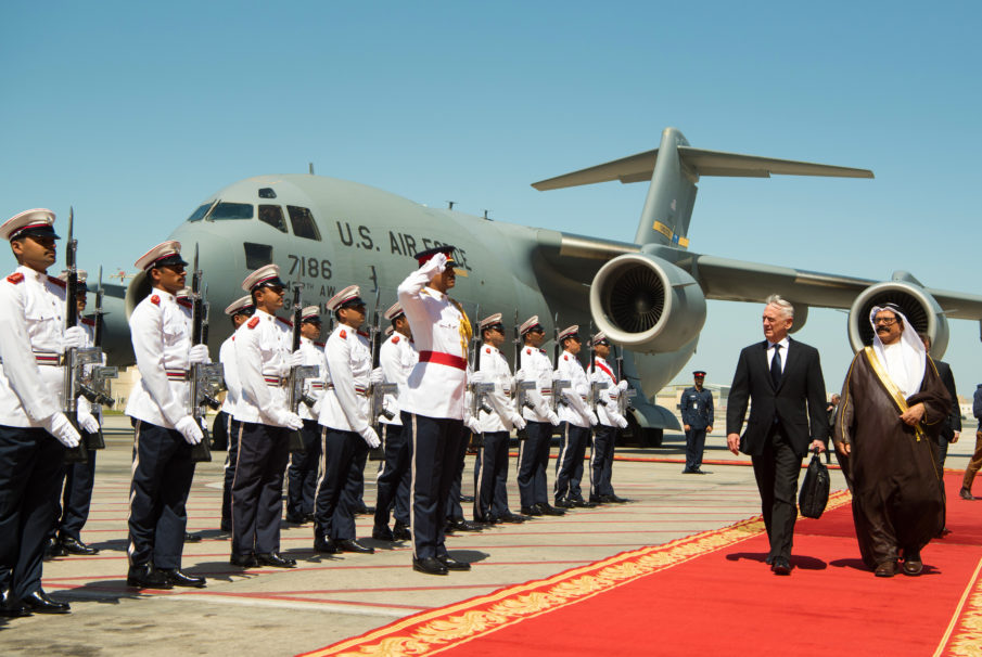 Featured image: Defense Secretary James N. Mattis walks with Bahraini Defense Minister Lt. Gen. Shaikh Yousuf bin Ahmed bin Hussain Al Jalahma after arriving in Manama, Bahrain, March 14, 2018. DoD photo by Army Sgt. Amber I. Smith