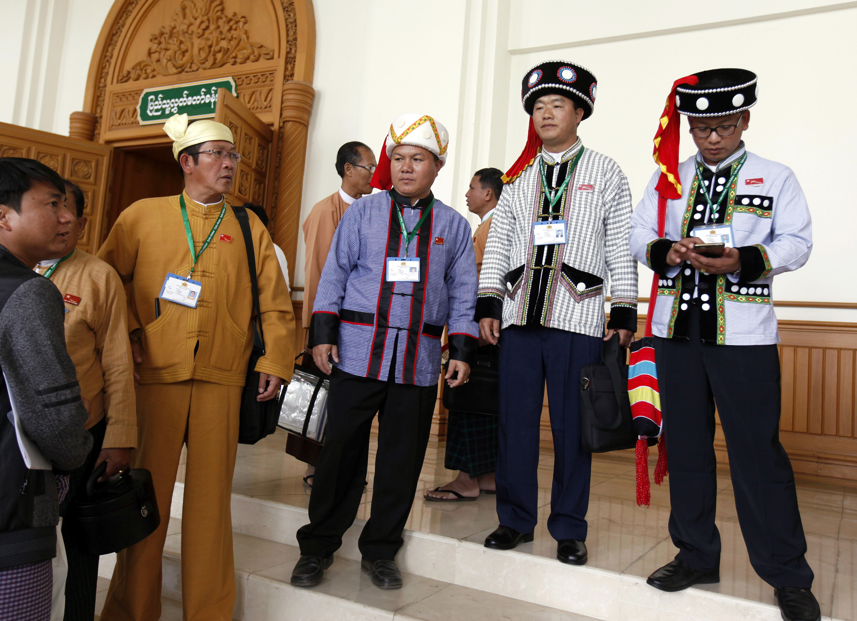 Clad in ethnic Shan and Lisu traditional attire, newly-elected members of parliament from Myanmar opposition leader Aung San Suu Kyi’s National League for Democracy party gather as they visit Lower House of parliament Wednesday, Jan. 27, 2016, in Naypyitaw, Myanmar. | AP Photo/Aung Shine Oo