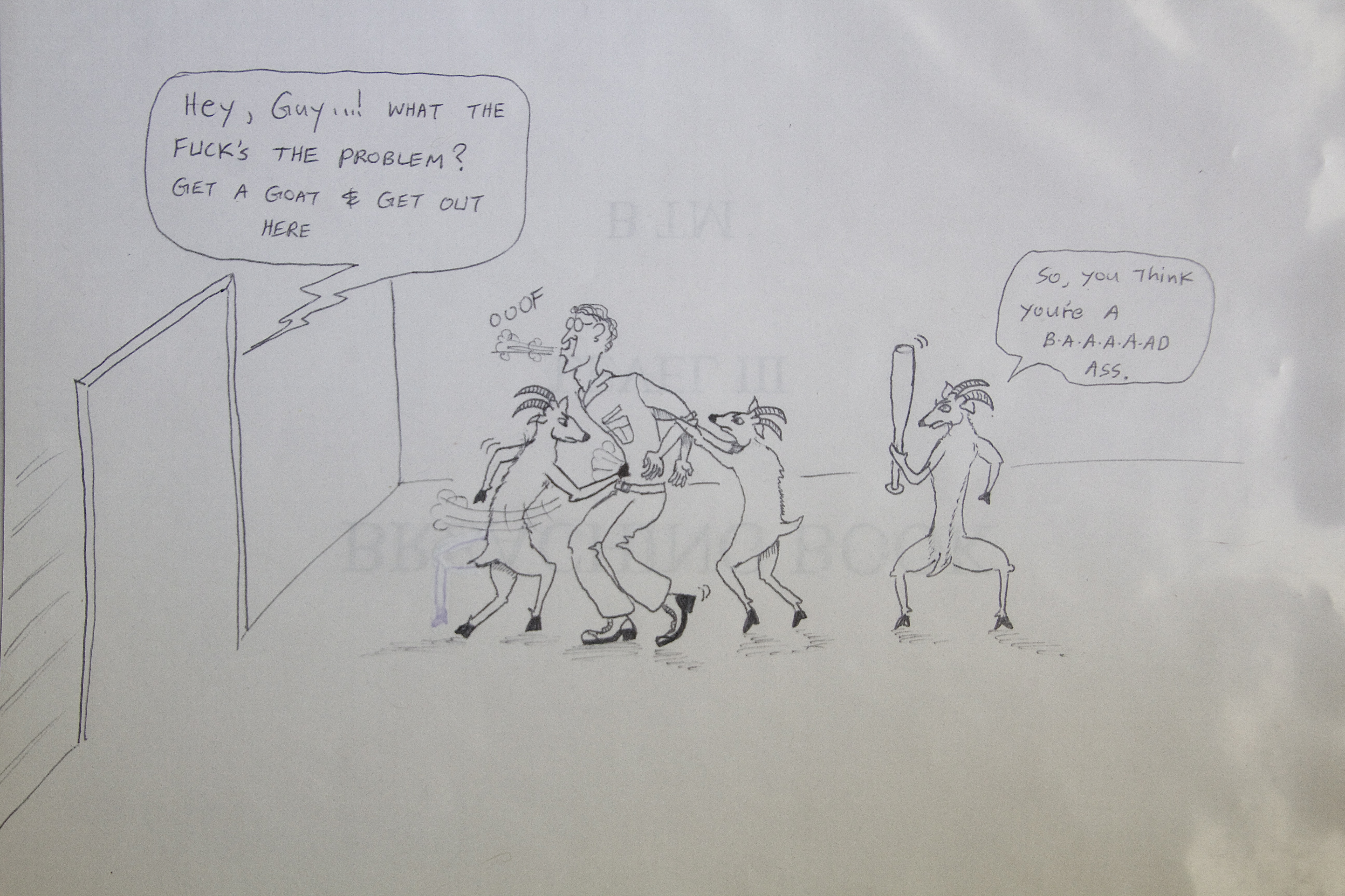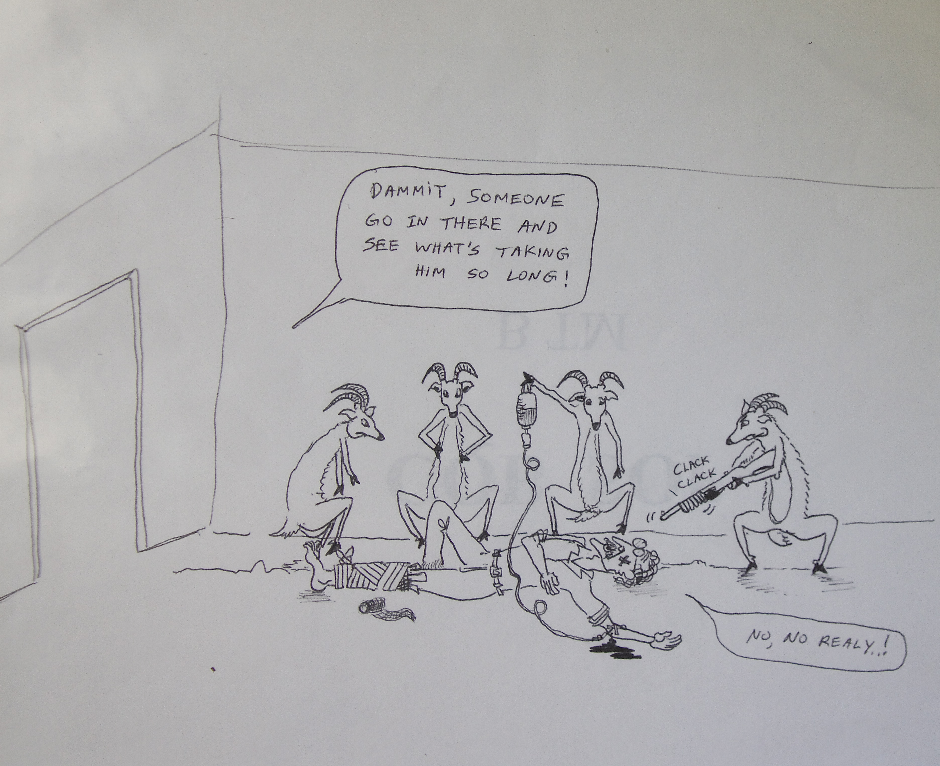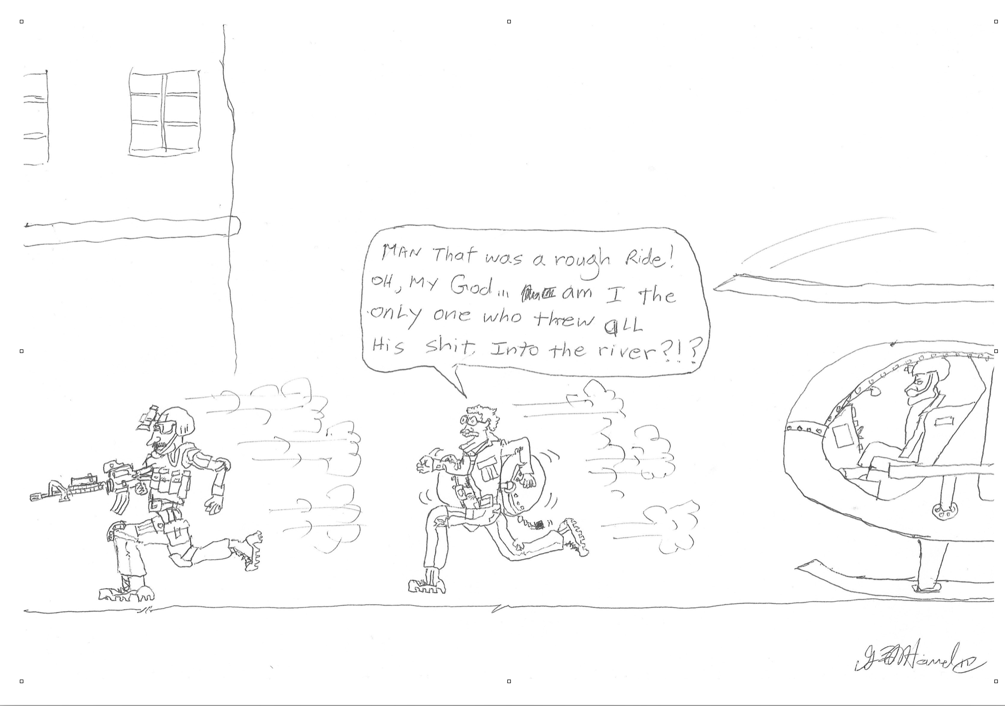 Guy frantically struggled to unhook his armored vest, which held most of his gear. I stared momentarily at the river rushing up at me, then started to rip Velcro and undo straps. By God’s grace, the helo leveled out, regained altitude, and resumed station in formation. Guy and I looked at each other with that age-old what-the-fuck expression, and frantically reconfigured our combat kit. We hit our objective hard and took names. Mission complete. Below is the cartoon I drew immortalizing Guy in the squadron cartoon book.