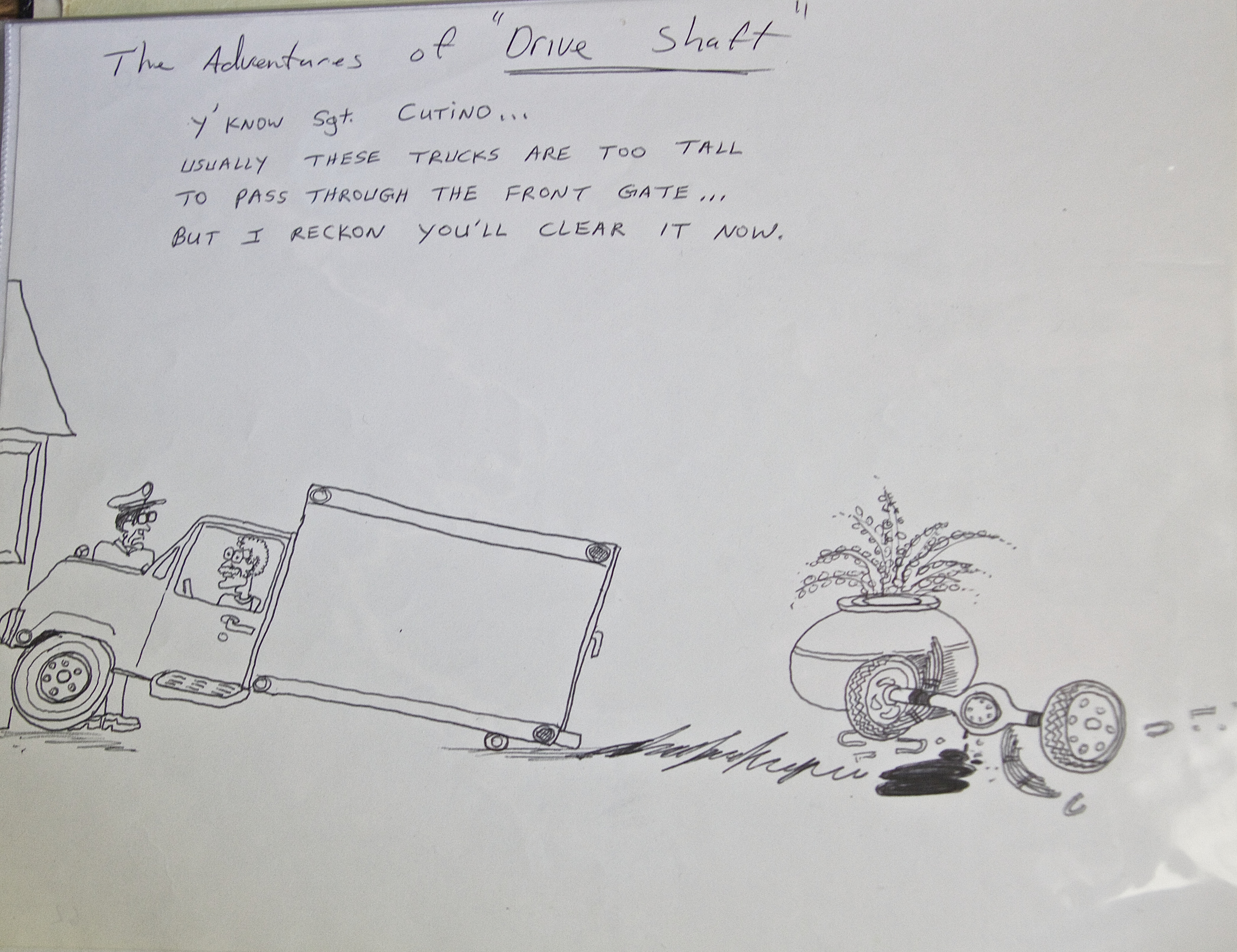 One particular night’s events inspired a cartoon I drew commemorating the experience. That night, Guy and I flew on a UH-6 Little Bird toward our objective. The flight route took us over the broad Ohio River. For that flight, we further engorged our ponderous combat gear with flotation devices. Guy and I sat on the external benches together on the same helo. We were both nervous about the long night time flight over the river. At some point, the helo inexplicably made a sharp dive toward the river. Apparently Guy and I had the same thought simultaneously: Ditch as much of your combat gear as possible and be ready to inflate flotation device as soon as we hit the drink!
