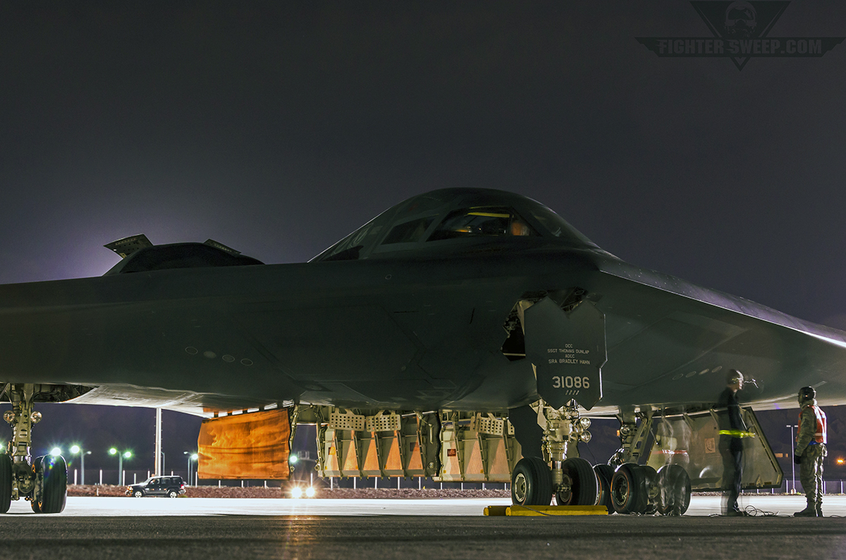A Northrop-Grumman B-2A Spirit sits at idle power, awaiting a hot crew swap during the Integration Phase of the U.S. Air Force Weapons School at Nellis AFB, Nevada. (Photo by Scott Wolff)