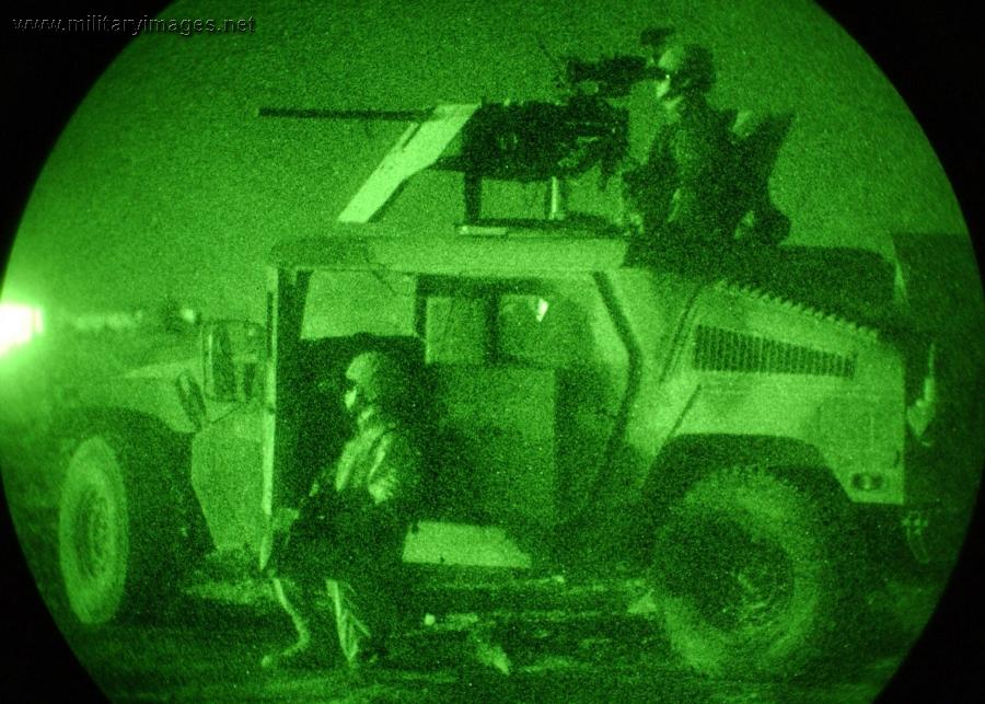 On the evening of Aug. 13, 2004, directly outside of Samarra, Iraq, SPC Stockbridge, right, and PFC Logsdon, both of 2nd Battalion 108th Infantry Regiment (2-108th), scan for suspicious activity during Operation Cajun Mousetrap, an exercise in Samarra, Iraq, geared towards routing all of the anti-coalition insurgents out of the city, to kick off. The 2-108th out of NY is in Iraq, supporting the 1st Infantry Division. (US Army Photo by Pfc. Elizabeth Erste)(Released)