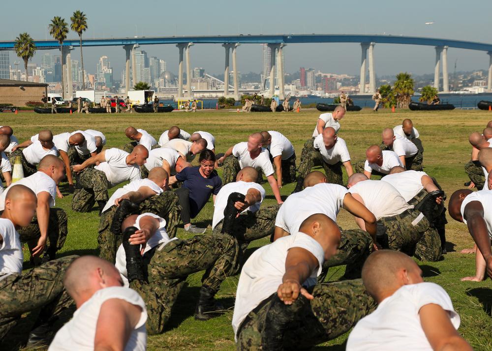Coronado, Calif. (Nov. 30, 2021) – Chief Mass Communication Specialist Joan Jennings, center, leads Navy Sea, Air and Land (SEAL) and Special Warfare Combatant-Craft Crewman (SWCC) candidates in stretching exercises to increase mobility onboard Naval Amphibious Base Coronado. Chief Jennings is an instructor at Naval Special Warfare Basic Training Command, a component of the Naval Special Warfare Center. NSWCEN provides initial assessment and selection and subsequent advanced training to the Sailors who make up the Navy’s SEAL and Special Boat communities. These communities support the NSW mission, providing maritime special operations forces to conduct full-spectrum operators, unilaterally or with partners, to support national objectives. For more information on the NSW assessment, selection, and training pathway, visit https://www.sealswcc.com/. (U.S. Navy photo by Benjamin K. Kittleson)