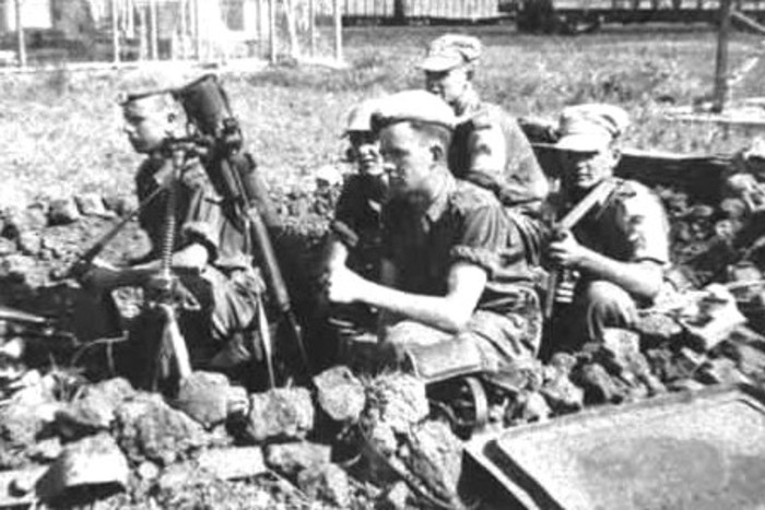 On the morning of 13 September, 1961, as the rest of the unit attended open-air mass, a lone sentry, Sergeant Billy Ready, stood watching a large open area nearby and distant wooded patches. Suddenly he spotted the approach of a large group of military vehicles and men with weapons. Unable to reach anyone by shouting, Ready fired a warning shot, which both alerted his unit to the approaching danger as well as touched off a coordinated attack by an estimated mixed force of between 3,000 and 5,000 local Luba warriors, settlers, and most unsettling, Belgian, French, and Rhodesian mercenaries hired to direct the attack. The Irish, as a peacekeeping force, were lightly armed with vintage rifles, water-cooled Vickers machine guns, and a few 60mm mortars. The attackers had both light and heavy arms, and even a light military trainer jet outfitted with bomb racks and machine guns for CAS (close air support).