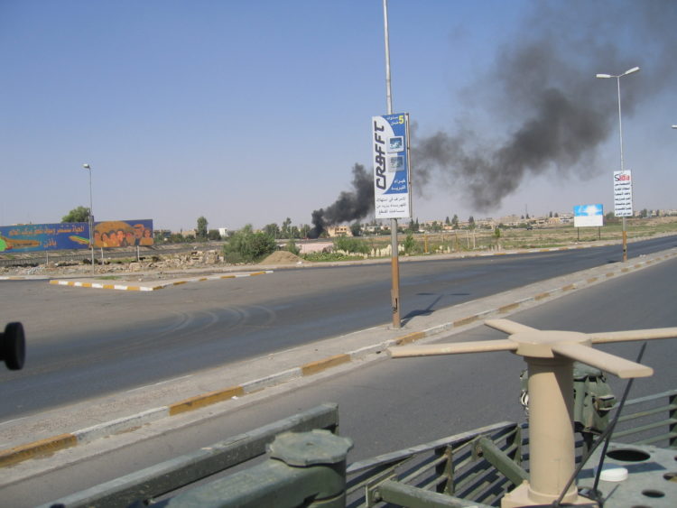 This was one of those days where I was just driving us into a general location, looking around for this asshole terrorist. We pretty much drove straight toward the column of smoke coming from the east end of the city. We pulled up near a flat, open area while we waited for the intelligence to be developed so we could, as the officers put it, “prosecute some more targets.” Now I could see the source of the smoke—it was a Stryker belonging to one of the conventional units. Flames were belching out the back of the Stryker, with rounds or some type of explosive cooking off inside. Other Strykers were driving around the area like bats out of hell. Whatever unit got hit was clearly in a panic.