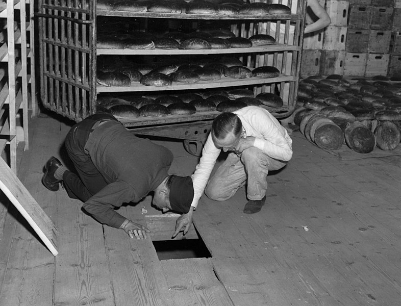 U.S. Lt. Robert R, Rogers, left, and Erich Pinkau of the German criminal police inspect the bakery and the hiding place of Leipke Distel, a member of Jewish revenge group Nakam, who had tried to poison loaves of bread for SS prisoners. (Unknown author, Public domain, via Wikimedia Commons)