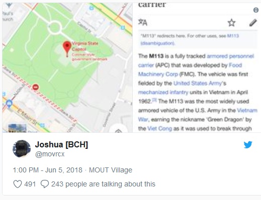 Digging deeper into his Twitter, however, it begins to seem like Yabut may have been losing his grip on reality. He also tweeted, “wow i think i just discovered a large illegal spy operation in the us government,” along with “i’m thinking about snitching.” At one point, he tweeted an image of the Wikipedia page for the M113 (the vehicle the M577 is based on) along with a map of Richmond, Virginia.