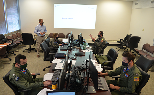 U.S. Navy air vehicle operators from VX-1 and VX-23 squadrons participate in MQ-25 simulation training. (Boeing)