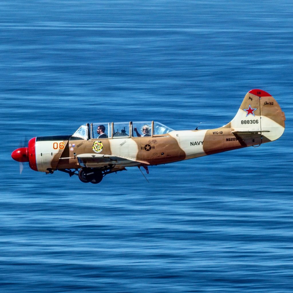 Navy SEAL Brandon Webb and his best friend Kamal Ravikant buzzing the California coast in the Russian Yak 52. (Courtesy of the author)