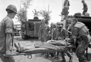 Lt. Thomas Norris in the background as LTC Iceal Hambleton (stretcher) is taken to be evacuated. (DoD)