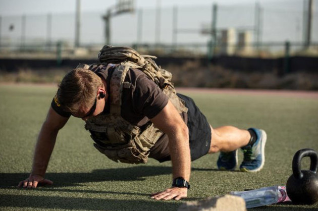 After a ten-minute rest, the test moves immediately into strength under load. Push-ups are performed for two minutes while wearing a 20-pound weighted vest or plate carrier. No sagging, no collapsing, no half reps. The standard is strict because the job is strict.