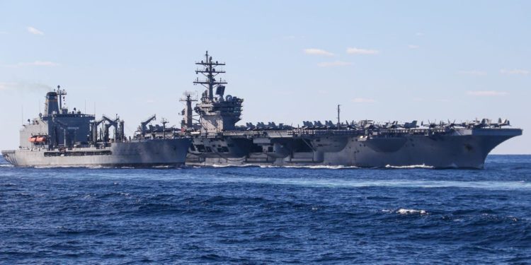 Nimitz-class aircraft carrier USS Dwight D. Eisenhower alongside USNS Kanawha for a replenishment-at-sea, February 4, 2021. US Navy/MCS Seaman Ryan Childress