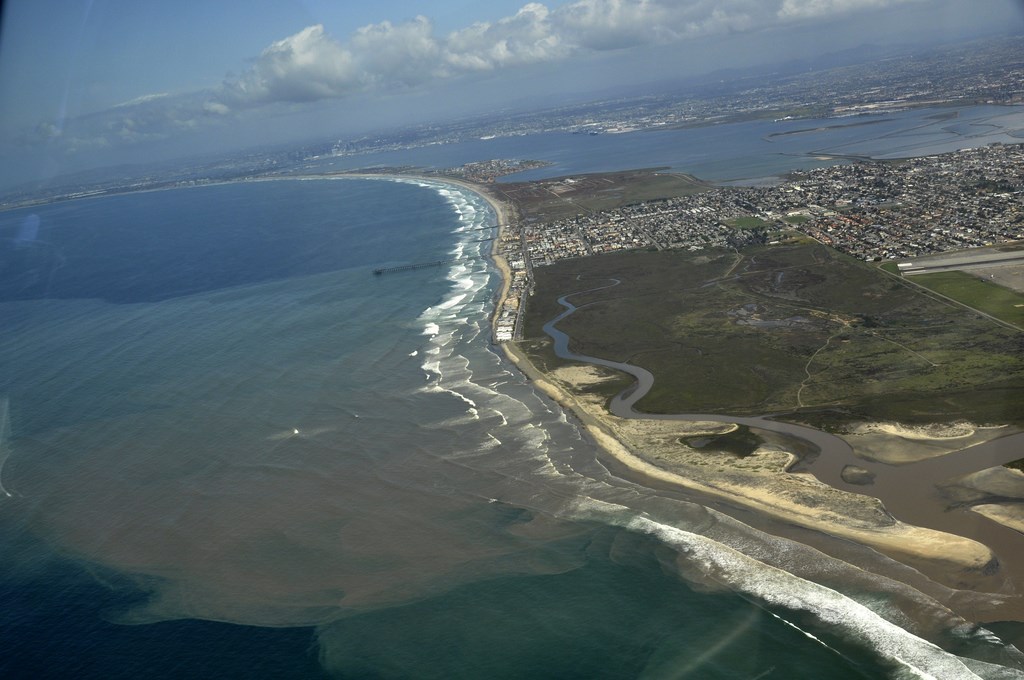 raw sewage in the Pacific ocean outflowing from the Tijuana river appears brown and muddy. Just beyond the pier extending into the ocean is the Naval Special Warfare Training Center. Residents of Imperial Beach frequently complain of the smell of raw sewage wafting into their homes and frequent beach closures due to the biohazard this presents to humans.