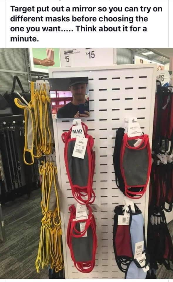 The mirror… step up all ye persnickety phux and try on masks. Now a person is going to put on a few masks, breathe in them all, then put them all back except one, and the next person is going to try on used masks. Now YOU are going to grab a mask that was breathed in by how many people? There’s a reason we are all not allowed to try on under-motherfucking-wear in department stores. How about I grab a bag of Cheetos, eat a few handfuls, then put the bag back. There’s a cogent reason that hospitals (try not to) reuse needles.