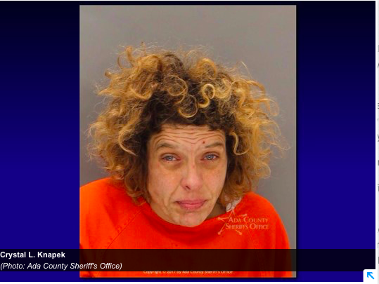 Knapek was taken to a hospital for evaluation, then was arrested and booked into the Ada County Jail on the following charges: Injury to Child (F), Indecent Exposure (m), Resisting and Obstructing Officers (m) and Controlled Substance – Use or Under the Influence in a Public Place (m).”