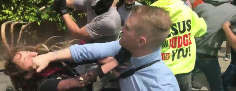 Further, it turns out that the guy who decked her was a well-known white nationalist and former Marine named Nathan Damigo, who, according to the LA Times, served time in jail: