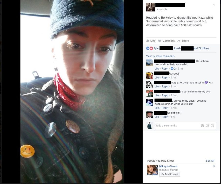 Recall that it was Trump supporters who secured the permits and scheduled the rally, and the opposition showed up to purposefully fight them. So this isn’t a case of, “Well, they’re equally bad.” One group showed up to hold a rally. The other group showed up to stop them. These “anti-fascist” idiots honestly believe that they are morally obligated to prevent the Trump supporters from exercising their First Amendment rights of freedom of assembly, which would make them the opposite of “anti-fascists.” America is one of the last countries on Earth with real freedom of speech and assembly, and it’s under constant threat by those who decide certain groups should not BE ALLOWED to have those constitutional rights. You didn’t see groups of Trump supporters throwing shit and beating people up at the Women’s March. So get the hell out of here with the “b-b-b-but she’s a GIRL!” nonsense. They were giving it out as good as they were taking it: