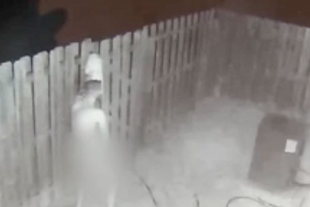 The video shows him eventually full nude appearing to pleasure himself and use her garden hose. He is also seen looking into her windows and trying to open the back door multiple times before jumping over the gate and leaving.”