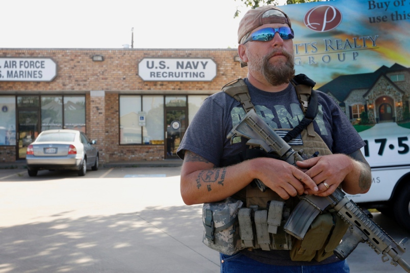 The U.S. Army newspaper reports: “Armed citizens—some associated with activist groups and militias—were standing vigil outside recruiting centers in Wisconsin, Georgia, Tennessee, Idaho, and elsewhere this week, saying they want to provide protection to servicemembers barred from carrying firearms on duty.”