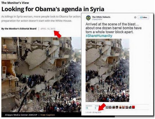 The deception doesn’t stop there, and with the alleged iconic photographs and videos sent around to the world, in a successful media shock doctrine campaign to garner support for the Syrian White Helmets and their networked terrorist affiliates. The photos and video were credited to Mustafa al-Sarout of the Aleppo Media Center, an al-Nusra media affiliate. Nevertheless, if it bleeds, it leads. Mainstream media outlets sprung into action to pick and showcase the low hanging fruit, and with no questions asked.