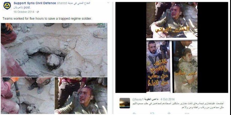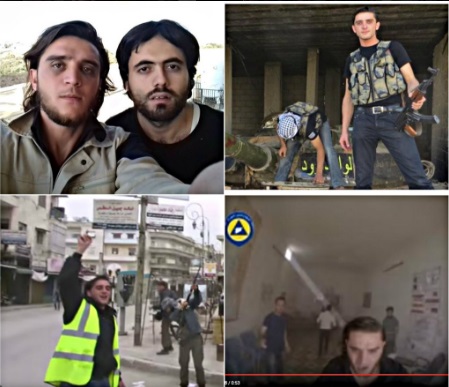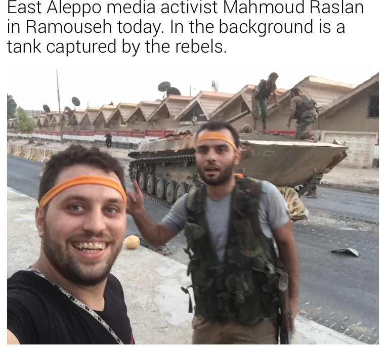 The video is clipped together and clearly working in tandem, and the other videographer is listed as photo-journalist for Al-Jazeera Mubasher. And yet, that is not the really bad part, and if you recall the beheading of a 12-year old boy in Syria, you’ll be able to identify the man photographed in the midst of staging media. You can review the NPR article and video to verify the screenshot, Mahmoud Raslan in the smiling company of child-killers, as a propagandist, and terrorist.