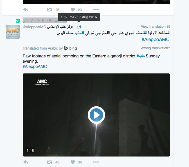 The video sourcing is also perplexing, with the original Twitter post of the video citing a local time of 15:52 Aleppo time, on Wednesday the 17th of August, yet the original Tweet, shown above, states that the video was filmed on Sunday the 14th of August.