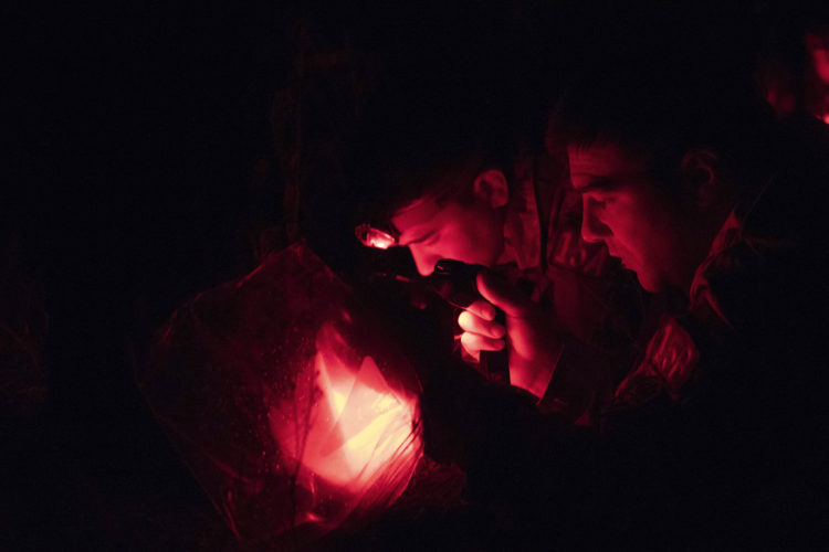 Army Sgt. Michael Metcalf and Spc. Walter Galdamez plot points on a map during a night land-navigation course, Jan. 27, 2021.