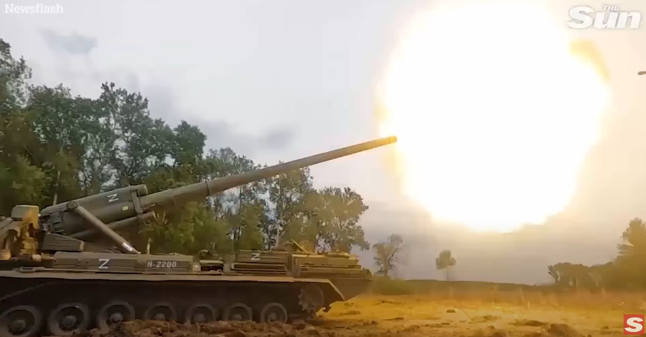 Russian artillery fires against targets in Ukraine. Note the “Z” designator on the weapon represents the Eastern Military District. Screenshot from YouTube and The Sun.
