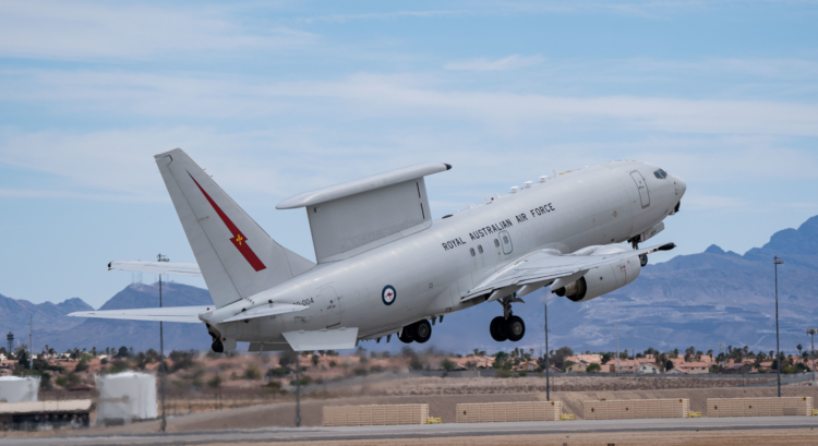 A Royal Australian Air Force (RAAF) E-7A Wedgetail takes off at Nellis Air Force Base, Nevada. (Image source: DVIDS)