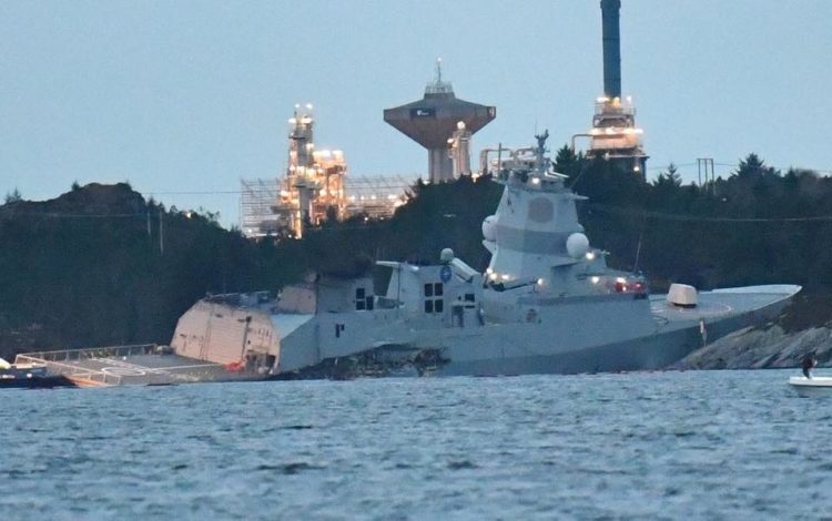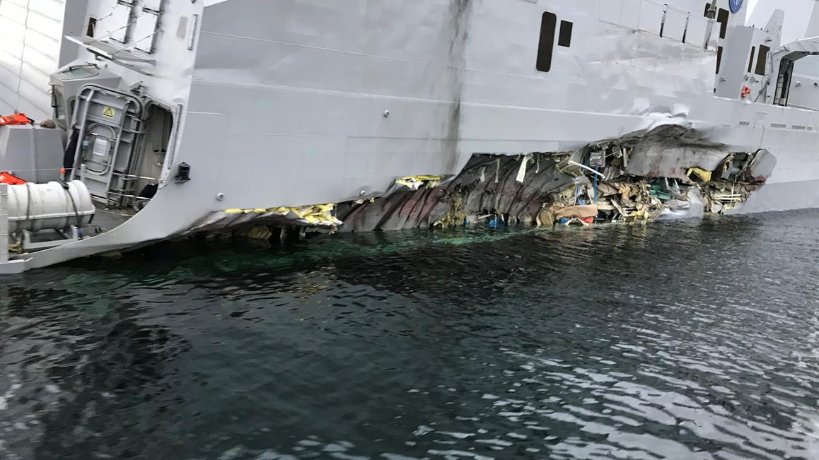 The KNM Helge Ingstad was beached near Sture, Norway to prevent her sinking after a collision at sea this morning.