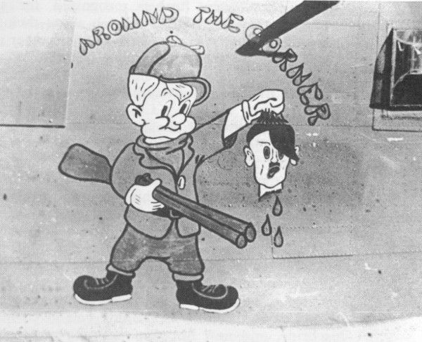 Nose art like the “Little Buckaroo” of pilot Major R.G. Rogers depicts an American cowboy who tames a horse that kicks the swastika sign as a representation of the Germans.