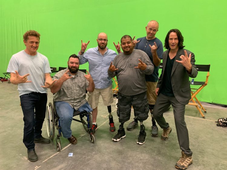 Another photo from the set of the latest Bill & Ted, in which @ed_solomon cast some wounded warriors as extras after helping @HomesForOurTrps with last year’s auction — can’t wait to see it! Thank you Ed, Keanu And @Winter! pic.twitter.com/vDnkBHccA1
