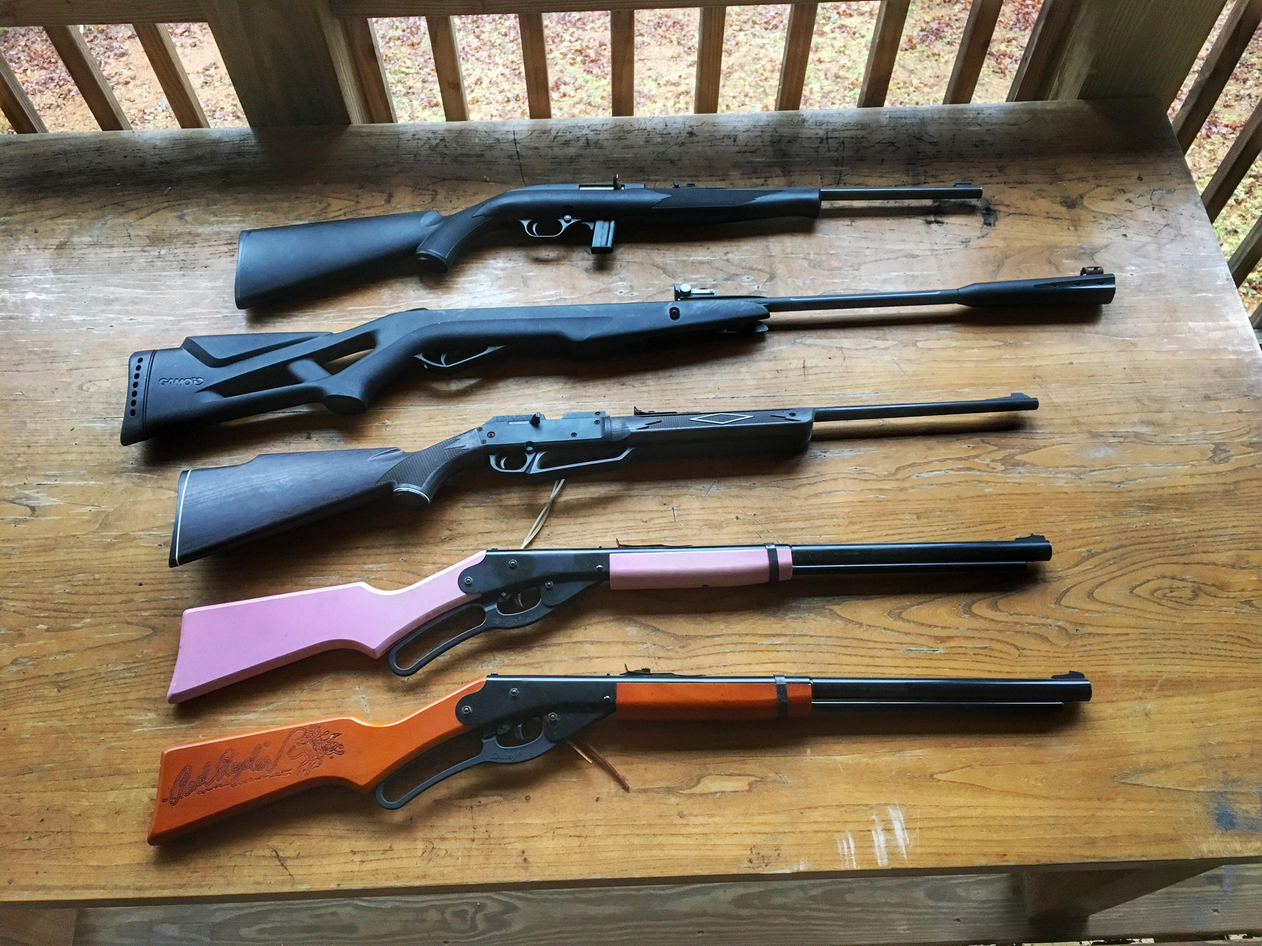 Our unintentional BB gun collection, with a Mossberg 702 Plinkster at the top for scale.