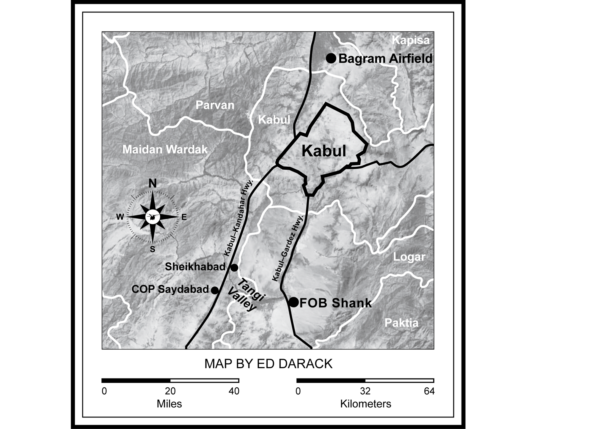 Shows locations of the Tangi Valley, the Chak Valley, and Mir Ahmadkhil, location of the Ginosa strike.