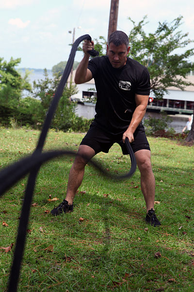 Dennis J. Yeddo, fitness facilities manager, fitness branch, Semper Fit division, Marine Corps Community Services, performs rope battles during a Paddle Fit Boot Camp workout aboard Marine Corps Base Camp Lejeune, July 23. (Cpl. Charles Clark, Public domain, via Wikimedia Commons)