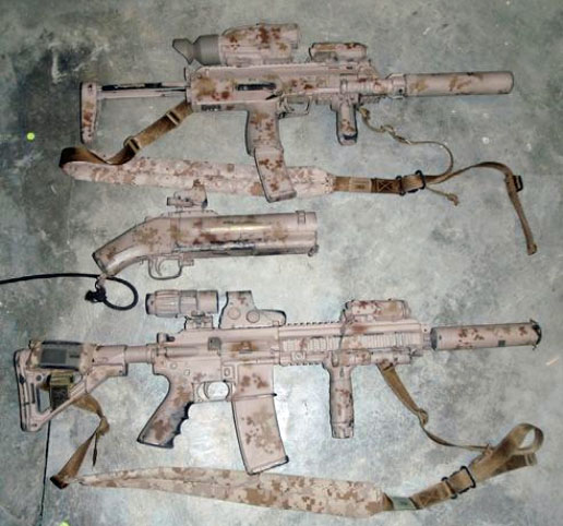 A standard SEAL Team 6 loadout. Notice the modified M79 in the middle.