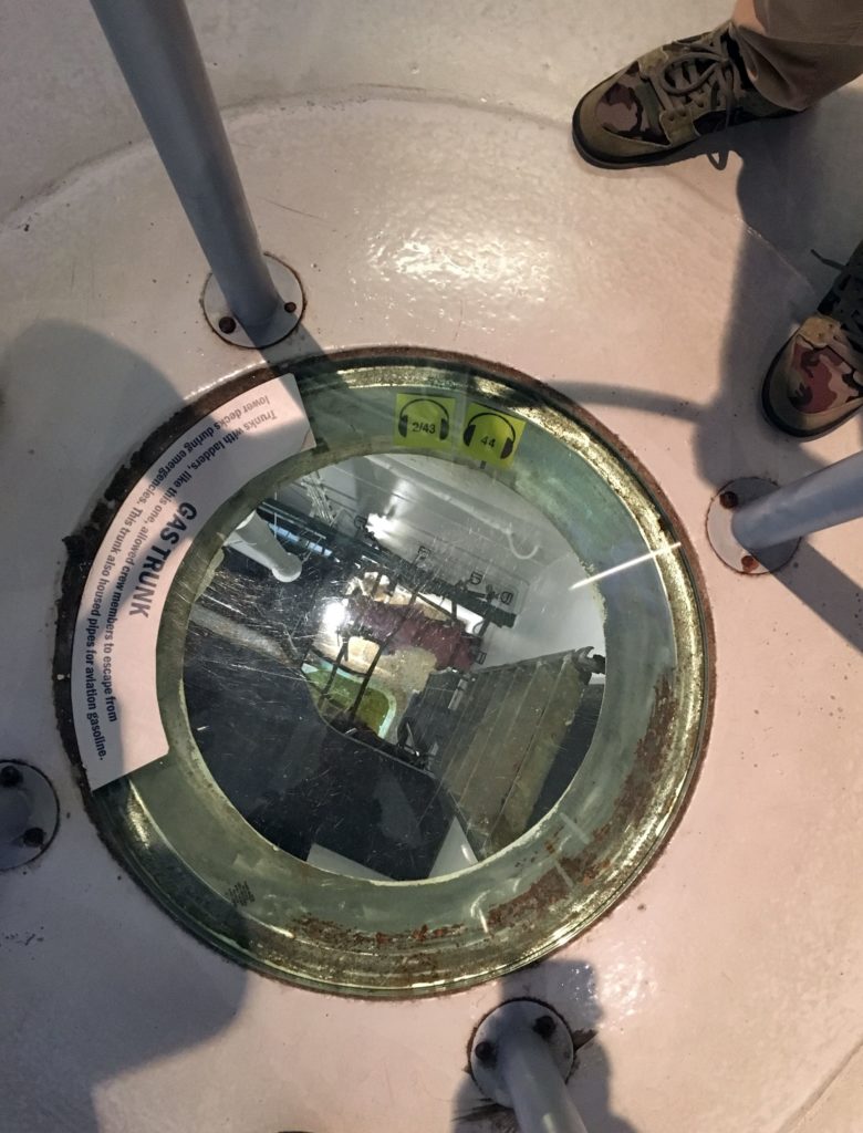 And the plot is off and running. Later on, as he continues his quiet reconnaissance, Finn takes a tour in the bomb assembly room deep in the lower decks, and then an ordnance magazine, which can only be accessed through a trunk line — a long vertical tunnel that serves as the trigger that brings his claustrophobia to the surface. (I took this trunk line shot on the Intrepid.)