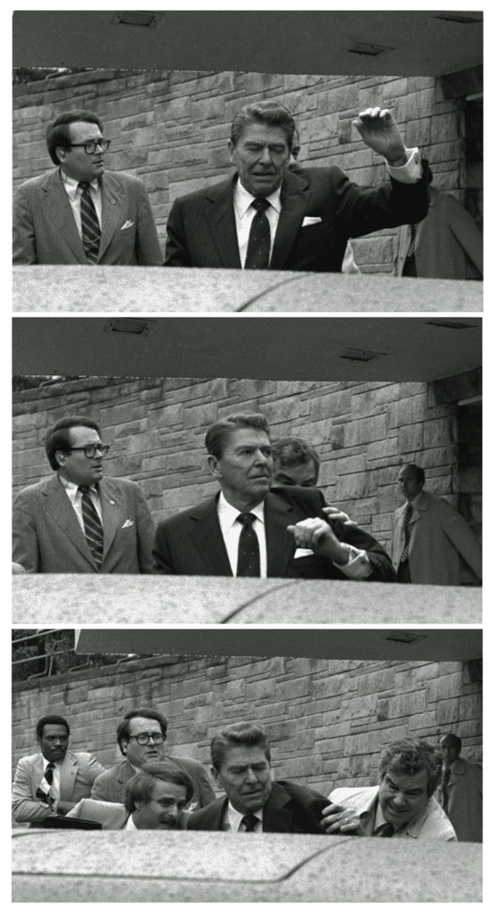 President Reagan would later say (included in the video below) that he did not know that he was shot until he was well inside the vehicle. This is actually quite common, for a commotion to begin, shots to be fired, adrenaline pumping, violent movement here and there — many don’t know they are shot until minutes later.