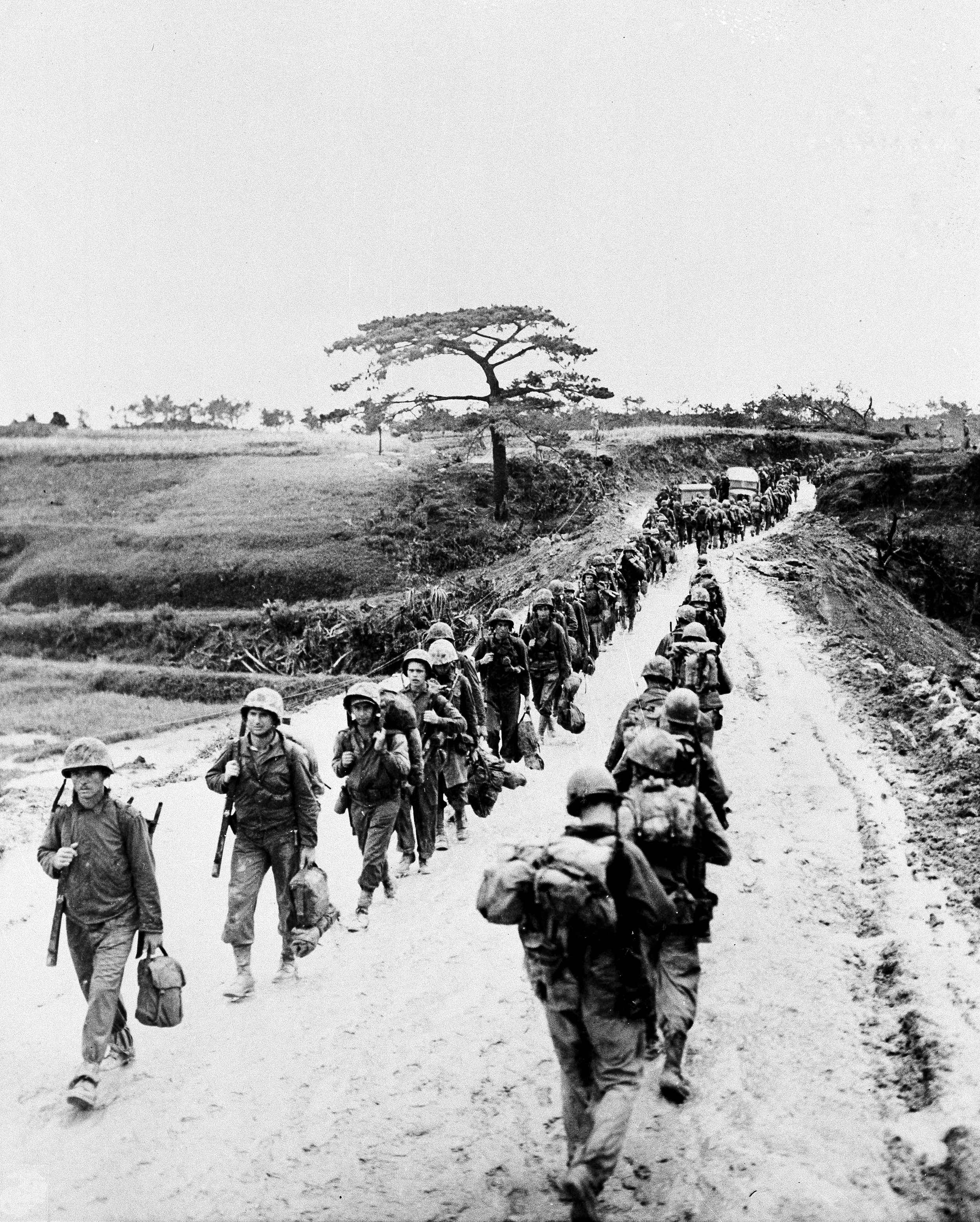 One file of Marines moves up to the front as another heads to the rear for a rest on V-E Day, May 7, 1945, when German forces in Europe officially surrendered to the United States, which seized Okinawa at a cost of 13,000 dead and 37,000 wounded. | AP Photo/U.S. Marines