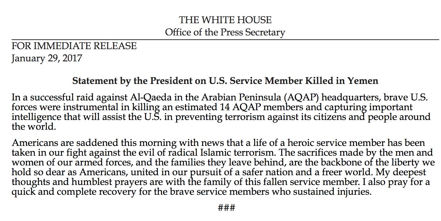 During the operation, a MV-22 Osprey crash-landed, injuring two additional service members. According to the White House Press Secretary, 14 al Qaeda in the Arabian Peninsula (AQAP) members were also killed during the raid.