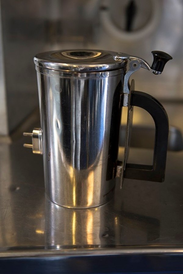 We did some checking and the coffee cup in question is not the ultra high tech hot beverage container made of nano-tubes coated with pure Unobtainium. It is a copy of a heated cup first made in the 1950s called, “The Helmco-Lacy Nestle’s Label Chocolate Hot Cup Warmer Heater.” We found one on WorthPoint that sold for about $100 bucks.